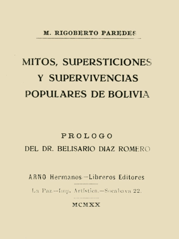 The Project Gutenberg EBook of Mitos, supersticiones y supervivencias populares de Bolivia, by Manuel Rigoberto Paredes This eBook is for the use of anyone anywhere in the United States and most other parts of the world at no cost and with almost no restrictions whatsoever. You may copy it, give it away or re-use it under the terms of the Project Gutenberg License included with this eBook or online at www.gutenberg.org. If you are not located in the United States, you'll have to check the laws of the country where you are located before using this ebook. Title: Mitos, supersticiones y supervivencias populares de Bolivia Author: Manuel Rigoberto Paredes Commentator: Belisario Diaz Romero Release Date: December 8, 2018 [EBook #58425] Language: Spanish Character set encoding: ISO-8859-1 *** START OF THIS PROJECT GUTENBERG EBOOK MITOS, SUPERSTICIONES Y *** Produced by Josep Cols Canals, Carlos R Colón and the Online Distributed Proofreading Team at http://www.pgdp.net (This file was produced from images generously made available by The Internet Archive/Canadian Libraries)