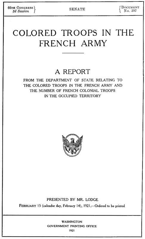 Mr. Dresel forwarded to the department also the original German edition of the pamphlet, “Colored Frenchmen on the Rhine,” the American edition of which, published by the New Times of Chicago, appears to be a literal translation with the addition of the words, “An appeal of white women to American womanhood.” It is perhaps worth noting that this pamphlet was published not in the Rhineland, but in Berlin, and that the avoidance of names makes it impossible to verify or disprove the specific allegations. Furthermore as Mr. Dresel has pointed out to the department, practically all the alleged instances of misconduct by the French black troops cited in the German press give no reference to date or place and are therefore of little value as evidence.
