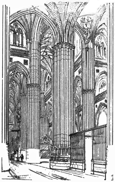 “One of the first elements is height. I know of no one thing in which one is so much astonished, in all one’s visits to foreign churches, as by the luxury of that art which could afford to be so daringly grand. From the small chapel, not forty feet long, to the glorious minster of some four hundred, one feels more and more impressed with the sense which the old men evidently entertained of its value; and exaggerated as it often is, even to the most curious extent, it is never contemptible. It is indeed19 a glorious element of grandeur, and not the less to be admired by Englishmen because we seem always to have preferred length to it; whilst they, so they could have height, cared little as to the length to which they could draw out a long arcade, and prolong the infinite perspective of a roof. And there is perhaps this advantage of height over length, that whilst the one seems entirely done for the glory of God, the other is always more apparently for use. So in a church, height in excess seems to typify the excess of their adoration who so built; whilst the greater length makes one think of possible calculations as to how many thousands of men and women might pass through, or how long a procession.... And as I have said so much about foreign examples I will but observe that the wonderful beauty of the apsidal east ends abroad ought to be gladly seized upon.... No one who has stood as I have at the west end of such a cathedral as that at Chartres, and watched the last rays die out from all other windows and at last gradually fade away from the eastern crown of light in its five windows; or who has seen the mounting sun come through all those openings one after the other, with matchless and continued brilliancy, would deny that such glorious beauties are catholic of necessity, and not to be confined by custom or etiquette to one age or one nation.”