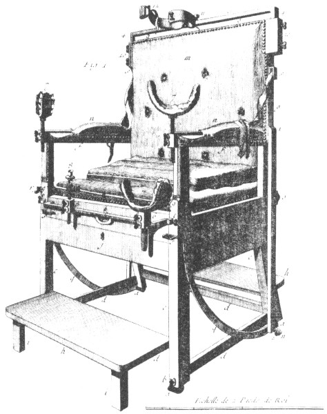 An eighteenth-century operating chair, fully equipped with tilting back, padded adjustable supports, and straps to keep the patient from writhing away from the knife. Anesthesia was limited to strong doses of spirituous liquors; antisepsis was unknown. The illustration is taken from Denis Diderot’s famous encyclopedia of arts and sciences.
