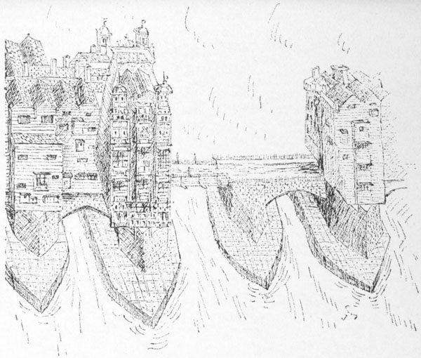 4. Old London Bridge. From an illumination in the MS. 16 F. ii. fol. 73, in the British Museum, containing the poems of Charles d’Orléans (fifteenth century). This is the oldest representation extant of the famous bridge built by Isembert and his peers. The painting, of which the upper part only is here given, represents the Tower of London with Charles d’Orléans sitting in it as a prisoner. In our reproduction may be seen the chapel of St. Thomas Becket and the houses on the bridge, the wharves along the City side of the water, and the tops of the white turrets of the Tower of London. The view was obviously painted from nature. A complete reproduction serves as a frontispiece for Vol. I of my “Literary History.” • 29
