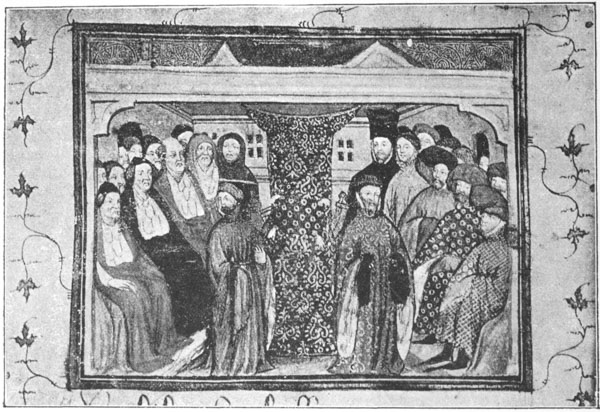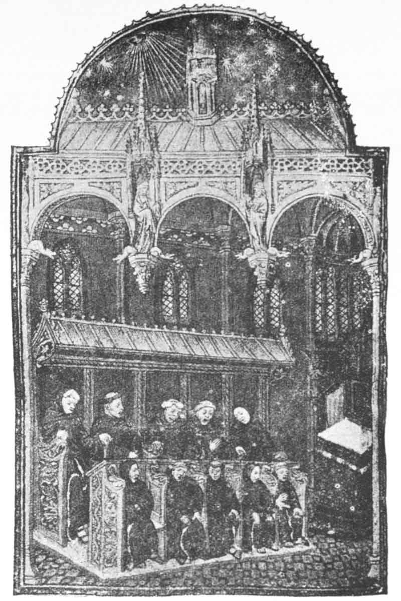 15. The parliament sitting in Westminster. From the MS. Harl. 1319, in the British Museum, fol. 57, painted circa 1400. This MS. contains a chronicle of the last years of Richard II, written in his native tongue by a French gentleman called Créton, who accompanied the king in his last journey to Ireland. It is invaluable both for its text and its pictures; in both the author seems to have been very careful to adhere to facts. He begins writing in verse, but afterwards takes to prose, stating that he is coming now to events of such importance that he prefers using prose, to make sure that he shall not allow himself to be led by fancy.