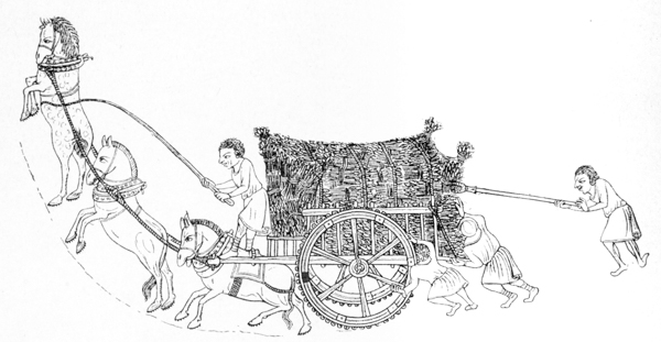 17. A reaper’s cart going up-hill. From the Louterell psalter; fac-simile of the engraving in the “Vetusta Monumenta,” Society of Antiquaries, vol. vi.; see in that vol., “Remarks on the Louterell psalter,” by J. G. Rokewood—“Dominus Galfridus Louterell me fieri fecit.” English, first half of the fourteenth century • 93