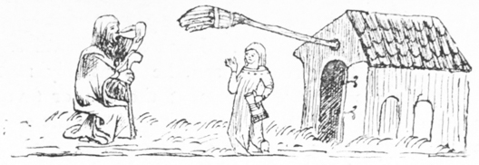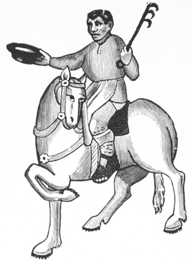 From the illumination in the Ellesmere MS. of the “Canterbury Tales.” The pot-hooks with three prongs, which he carries, were the distinctive attribute of cooks and cookmaids, and appear on all representations of such people: several are to be found in the Louterell psalter; see “Vetusta Monumenta,” vol. vi., the Roy. MS. 10 E. IV., passim, &c. They used it to turn the meat and take it out of the deep round-bellied pots, standing on three legs over the fire, which were then in common use • 116