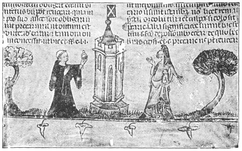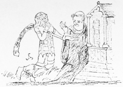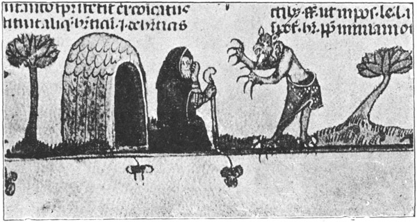 30. A Hermit in his solitude, tempted by the devil; MS. 10 E. IV., fol. 113 b. The miniature reproduced is one out of several which illustrate a well-known mediæval tale. Here it may be remarked that though this MS., invaluable as it is for the study of English customs, dresses, &c., during the fourteenth century has been often made use of, it has perhaps never been so thoroughly studied as it deserves. It contains Decretals, with marginal coloured drawings of the highest value on account of their variety and the subjects they illustrate. Not only a number of games and trades are there represented, with many miracles of the Virgin, &c., but there are also complete tales told by the draughtsman, without words, and only with the help of his colours. He does not invent his stories, but simply illustrates the fabliaux which he remembered and particularly relished. The drawing here belongs to the story of the “hermit who got drunk.” As he was once sitting before his cell he was tempted by the devil, who reproached him with his continual virtue, and entreated him to sin at least once, recommending him to choose either to get drunk or to commit adultery or to commit murder. The hermit chose the first as being the least (see below, p. 133, the picture where he is seen at his drink). But when he has once got drunk he finds on his way the wife of his friend the miller; he commits adultery with her, and then meeting the husband, kills him. The text of the tale is in Méon, “Nouveau recueil de fabliaux,” 1829, vol. ii. p. 173, “De l’ermite qui s’enyvra” • 144