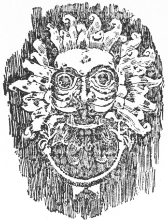 32. The Durham knocker (Norman), affixed to one of the doors of the cathedral. Fugitives used it to be admitted to sanctuary. Cf. a capital in the church at Saint Nectaire, Puy de Dôme, XIth century, representing, in accordance with Professor Enlart’s interpretation, a man who flies to sanctuary and embraces a column thereof, while an angel with drawn sword stands by to protect him • 158