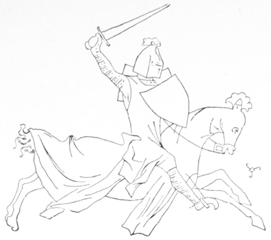 1. Knights travelling, followed by their escort of archers. From the MS. Harleian 1319, in the British Museum, fol. 25, painted circa 1400 (below No. 15). The two travellers are the Duke of Exeter and the Duke of Surrey; they go to meet Henry of Lancaster at Chester, to whom they are sent by King Richard II, August 1399. • Frontispiece 4