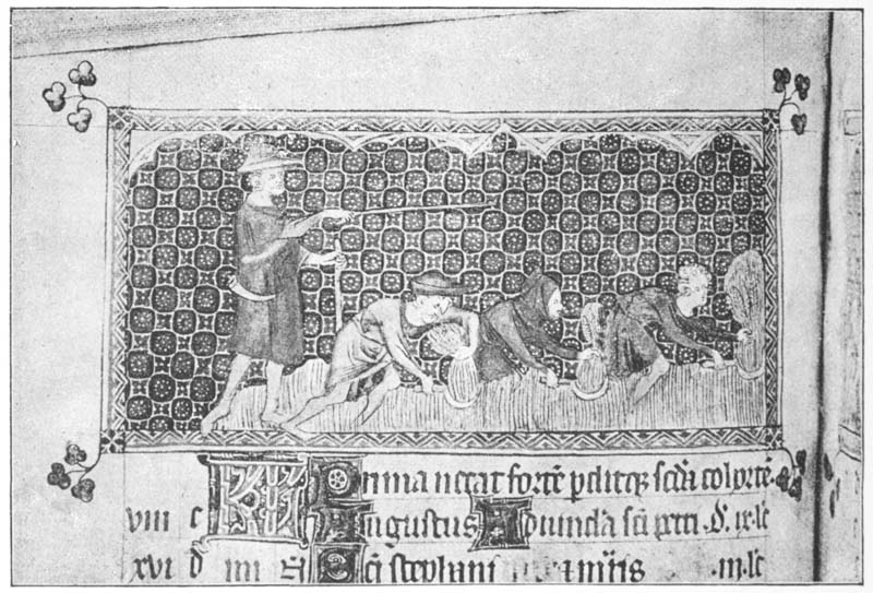 50. Reaping time. Labourers reaping corn under the supervision of the hayward. From the MS. 2 B. vii., fol. 78 b. English, early fourteenth century. “They dwell in fayre houses, and we haue the payne and traueyle, rayne and wynd in the feldes” (speech of John Ball, in Lord Berners’ Froissart, chap. ccclxxxi). The overseer shown in the drawing may possibly be a bailiff: “Supervidere debet ballivus falcatores, messores, cariatores,” &c. (“Fleta,” cap. 73), or a provost, who had about the same duties, but was practically chosen by the peasants themselves. But it seems more likely to be a hayward; the dress and attitude better suit a man in that station. The care of seeing that “repemen . . . repe besili and clenli,” was sometimes entrusted to such officers; see Skeat, “Notes to Piers the Plowman,” Early English Text Society, 1877, p. 273. A horn, such as our man bears, was always carried by haywards, who used to blow it to warn off people from straying in the crops. The rough and commanding attitude seen in the drawing would not be so readily expected from a bailiff with his juridical knowledge and comparatively high function, or from a provost appointed by the peasants themselves, as from a hayward or garde champêtre • 267