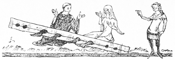 51. In the stocks. A woman and a monk are put into them; a gentleman abuses them. From the MS. 10 E. IV., fol. 187, where it forms part of a series of drawings illustrating a fabliau of the same sort as the one alluded to above (illustration No. 28). It is called, Du soucretain et de la fame au chevalier; the author is Rutebeuf, and it may be found in the works of this the most famous of the French thirteenth-century poets (ed. Jubinal, or ed. Kressner) • 272
