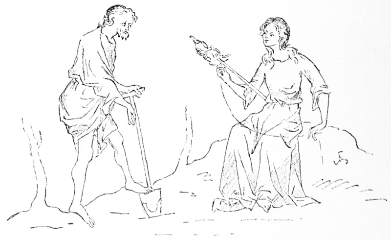 55. “When Adam delved and Eve span”—the text of John Ball’s harangue (same idea in Wace’s “Roman de Rou,” l. 6027), illustrated from the early fourteenth-century MS., 2 B. vii., 4 b, in the British Museum. (English) • 287