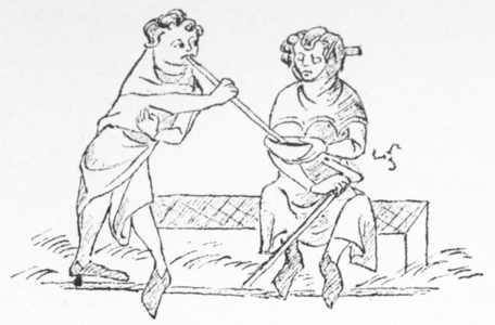 23. A family dinner. From the MS. Addit. 28162, in the British Museum, fol. 10 b, early fourteenth century; French. Note the carver, the cup-bearer, the musicians, the marshal of the hall, whose mission it is to expel objectionable intruders, whether men or dogs. In the present case, while this officer is expelling a very objectionable lazar, come under pretence of sprinkling the diners with holy water, a little further a dog seizes his opportunity, and gets hold of a fish on the table. The carver grasps the meat with his left hand; forks then were unknown, but good breeding was, nevertheless, not neglected, and it consisted in the server’s touching the meat only with the left hand. Writing later than the time we speak of, John Russell, marshal of the hall to Duke Humphrey of Gloucester (fifteenth century), adds one refinement more, that is to use only three fingers of the left hand. This was, in his mind, the acme of fine breeding: