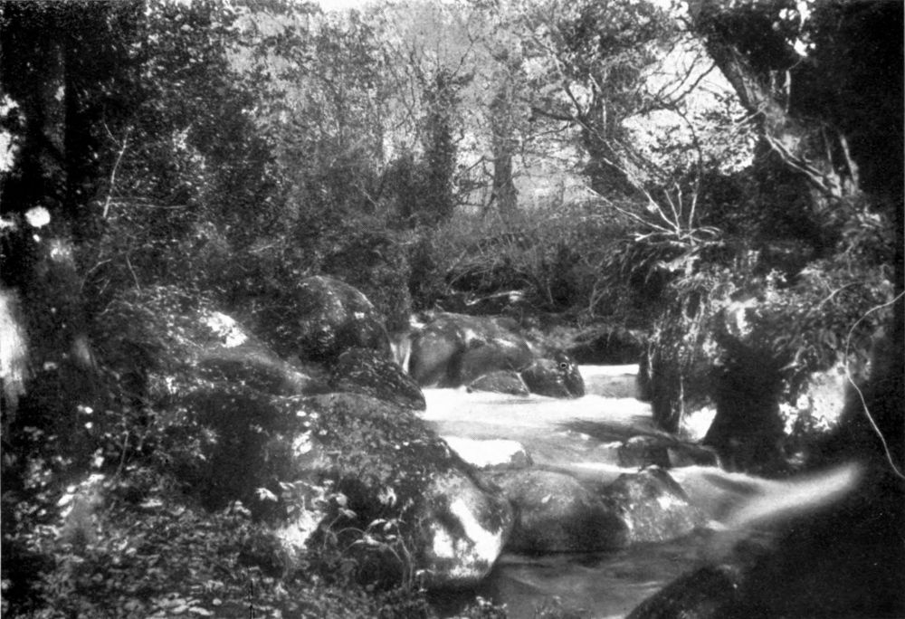 They tell this story of a place near here:—The master of the house was dead and buried, yet came home every night, and tramped about. As the family felt this was a parson’s job, the parson came one night, and threw a handful of churchyard mould in the face of his deceased parishioner, who thereupon became a black pony. (In these stories the churchyard mould always turns the ghost into a black creature of some sort, but not always as nice a creature as a Dartmoor pony.) They got a halter, and told a boy to run the pony down the side of the valley as hard as ever he could, and jump it across the Wrey. He did as he was told; but, when he jumped, he found he had the halter only, and no pony.—Ghosts cannot cross water; and this ghost of a pony was run down the hill at such a pace that it could not stop itself. It had to attempt the crossing of the water, and vanished in the attempt.{14}
