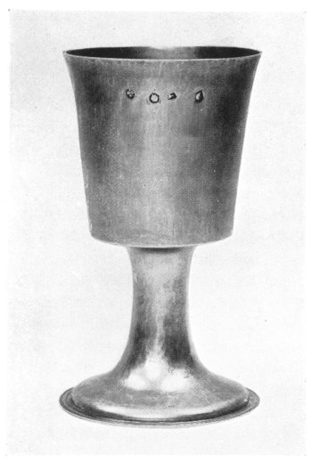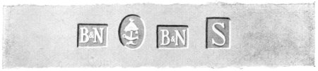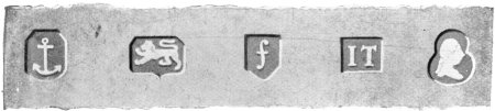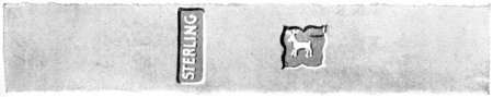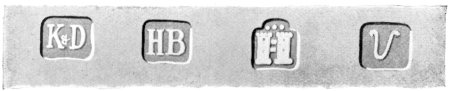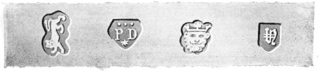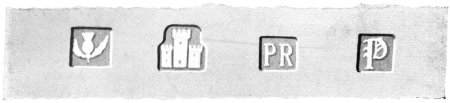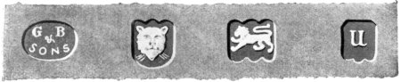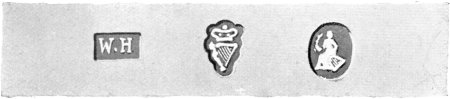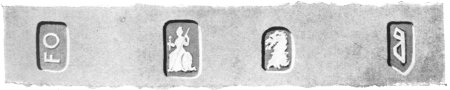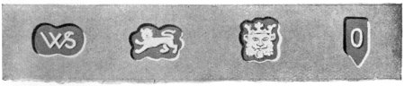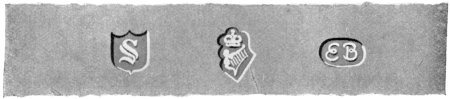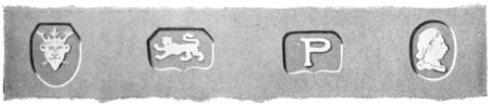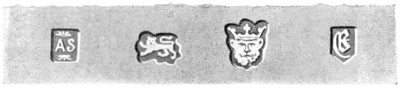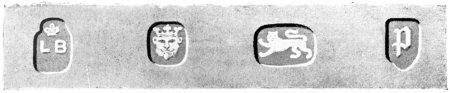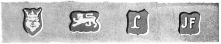 The marks on silver are stamped, the design thus appears in relief, while the edges of the shield on which it appears are sunk. The reproduction of this has offered a difficulty in illustration in all volumes{14} on old silver. To print black letters or designs on a white background, although easy, is unsatisfactory. On the contrary, to print the raised design in white on a dead black background is not a realistic presentation of the mark as it appears to the eye. After many experiments I have reproduced the marks in a manner more closely approaching their actual appearance, and less suggestive of black-and-white designs on paper.