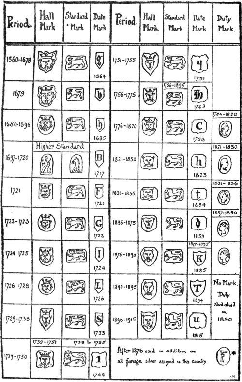 I have given sufficient space to marks in the present volume to indicate those used by the London and other assay offices. Some marks are given which do not appear elsewhere, and the arrangement of the tables should enable the beginner to come to a definite conclusion as to the date of his silver. In especial, the Table of variations in the shapes of shields in the hall-mark and standard-mark employed at the London Assay Office from the accession of Queen Elizabeth to the present day, is a feature not before given in so concise a form in any other volume.