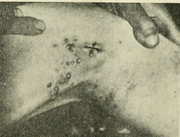 (2) A woman, aged 38 years, suffering from a curious eruption associated with obscure nerve symptoms. The history showed that four years ago she had suffered from some chest affection, accompanied by the expectoration of blood and offensive matter. She was ill three months, and during her convalescence she scratched her right thumb, and a lymphangitis of the arm, with axillary abscess, resulted. She next developed a painful swelling of the right elbow, which was opened and drained, and she thought a piece of bone came away; the arm was put up in splints. The right elbow had been stiff since that time, and during its healing she had developed pricking sensations in the fingers, which became contracted. There was then an interval of nine months’ good health, after which, two years ago, she developed an abscess in front of the right thigh, which eventually broke, and laid her up for four months. Subsequently, about eighteen months ago, the rash appeared, at first round the site of the abscess, then spreading towards the buttock and loin, and finally extending down the leg.