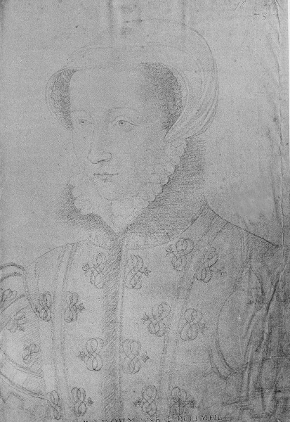 Je crois avoir retrouvé la plupart d’entre eux dans les dessins aujourd’hui conservés à Castle Howard en Angleterre. On voit dans cette collection célèbre le petit dauphin François, fait en juillet 1552; Charles-Maximilien, depuis Charles IX, également daté du même temps, et enfin «Marie royne d’Escosse en l’eage de neuf ans et six mois, l’an 1552 au mois de juillet[18]». C’est la première fois que ces rapprochements sont faits, ils fixent un point curieux de l’iconographie de Marie Stuart, mais l’œuvre hâtive du peintre ne permet point d’y attacher une importance énorme. L’enfant est tranquillement posée; elle a son maintien raisonnable de personne importante; son costume est très riche, un peu vieillot pour elle. Le nez est fort, les yeux vifs et noirs. Par une bizarrerie inconcevable, ce portrait, en passant chez Alexandre Lenoir, avait été baptisé Marie de Guise, mère de Marie Stuart, et c’est sous ce nom d’emprunt que Prieur l’avait lithographié, au commencement de notre siècle[19].