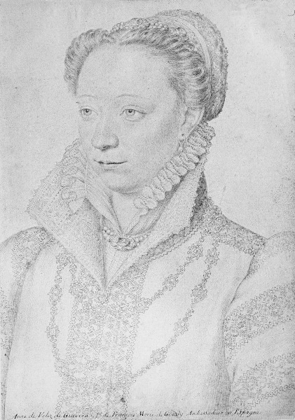 Elle donna séance au peintre de la cour, dans le costume délicieux qu’on lui avait imposé: coiffure en arcelets, chargée d’un escoffion, ornée de perles et de joyaux, fraise délicate au col, corsage à gros bouillons de soie cachant la poitrine, manches à épaulières surélevées. C’est l’œuvre officielle, celle qui sera mille fois copiée pour porter dans toute la France les traits de la nouvelle reine. L’original en peinture est aujourd’hui conservé au Louvre; il est donné à Clouet par tous les catalogues, ce qui doit être une tradition, mais il avait appartenu à Roger de Gaignières au XVIIe siècle, et celui-ci ne faisait aucune attribution. Avant que de passer à l’exécution définitive, l’artiste s’était servi du crayon, et cette esquisse sur nature, ce premier jet appartient aujourd’hui à la Bibliothèque nationale[21].