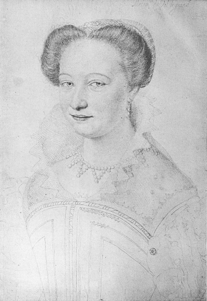 Et tout à coup, vers les trente-six ou trente-sept ans, au moment précis où fut dessinée, par Jean Clouet peut-être, la figure ici reproduite, on la donna comme compagne au jeune Dauphin Henri, qui était demeuré un enfant triste et doux, sans volonté et sans initiative. Son rôle devait être de le dégourdir, ou comme on disait alors, de «moyenner» son éducation mondaine. Qu’y avait-il à craindre d’une dame dont les deux filles, [Pg 16] à peu près du même âge que le prince, cherchaient des épouseurs depuis une ou deux années? Les relations commencèrent en tout bien tout honneur; le prince se laissa doucement caresser par cette opulente matrone qui avait le mot gai et la phrase leste, peu ou point de scrupules, et que les ambitions de l’âge mûr mordaient cruellement. Elle eût pu être sa mère, elle devint sa confidente, sa conseillère intime, et s’abandonna certain jour au jouvenceau, en pesant les conséquences probables de sa chute.