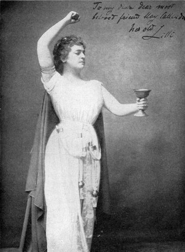 My fellow director was my boy friend, Gustav Schirmer, son of the publisher, and our first production was, of course, a Wagner music drama. Gustav’s mother was an enthusiastic Wagnerite who eventually spent much of her life in Bayreuth and Weimar. “Rhinegold” seemed to me especially fitted for our theatre as it offered almost boundless scenic opportunities. The effect of water in the first scene which is supposed to depict the depths of the Rhine, I achieved very successfully by several alternate curtains of blue and green gauze, and behind the rocky reef in the centre of this scene a gas-burner was very cleverly hidden, the light of which, as it gradually increased in strength, brilliantly simulated the awakening of the “Rhinegold.”