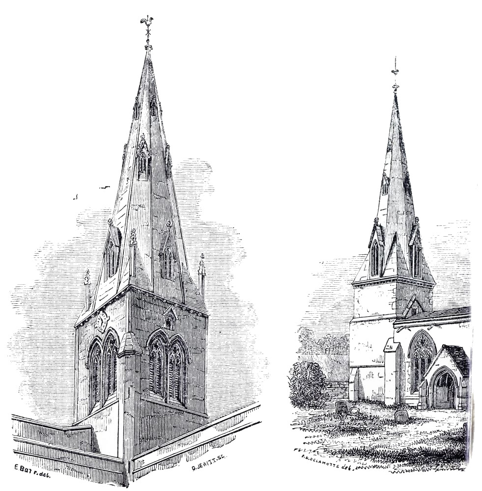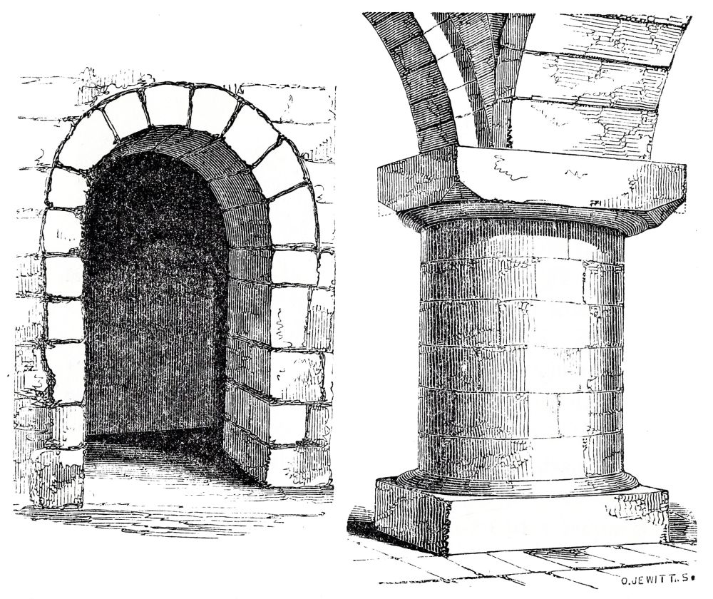 We have a strong confirmation of this in the city of Lincoln: the Conqueror having taken possession of about a quarter of the old city to build a castle upon, and Bishop Remigius having purchased nearly another quarter to build a cathedral and monastery, the Saxon inhabitants were driven down the hill on which the old city stands, and took possession of some swampy land at the foot of the hill, which they drained, and redeemed from the fens or marshes of which nearly all the low country then consisted. On this new land they built several churches. One of these, St. Peter’s at Gowts (or at the Sluices), remains nearly entire, and St. Mary le Wig-ford has retained the tower built at this period. This is an important and interesting fact in the history of architecture, as it confirms what was before only a natural supposition, and it enables us to fill up a gap: we appeared to have scarcely any parish churches of the early Norman period, but it is now evident that many of the long list of churches of the Anglo-Saxon type belong to a period subsequent to the Conquest. The tower of St. Michael’s Church, Oxford, is one of those included by Rickman as of the character supposed to be Saxon, but the imposts of the window-arches are quite of Norman character, and{20} it was built after the Conquest. The tower of Oxford Castle was built by Robert D’Oyly in the time of William Rufus, but it has much of the appearance of the Saxon buildings, and the tower of St. Michael’s Church is part of the work of his time. Round towers built of rubble-stone are of several periods, generally early, but in a mere rubble wall there is nothing to go by as to the date; they may be of any period.
