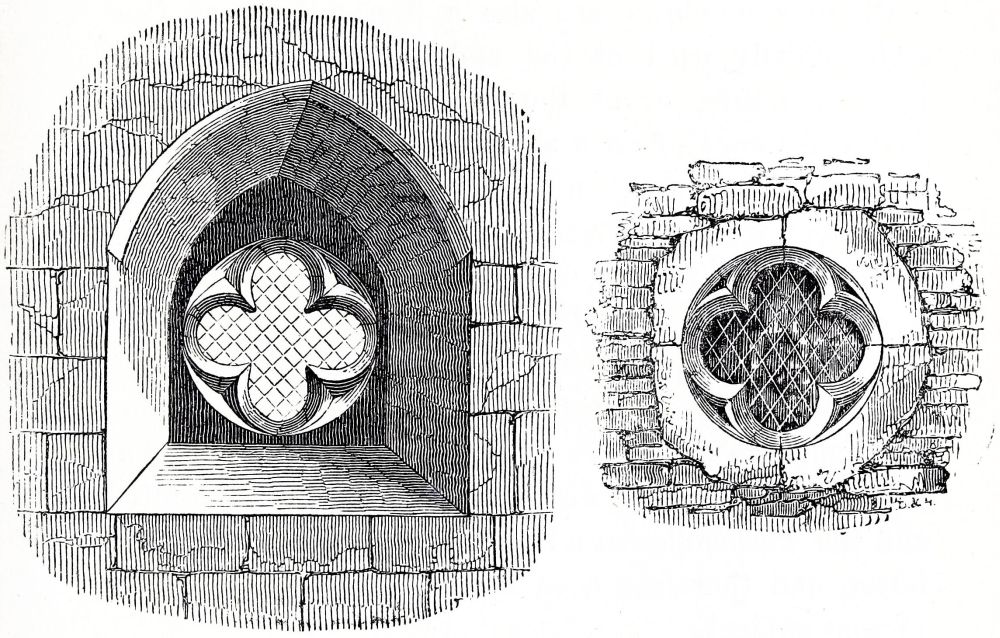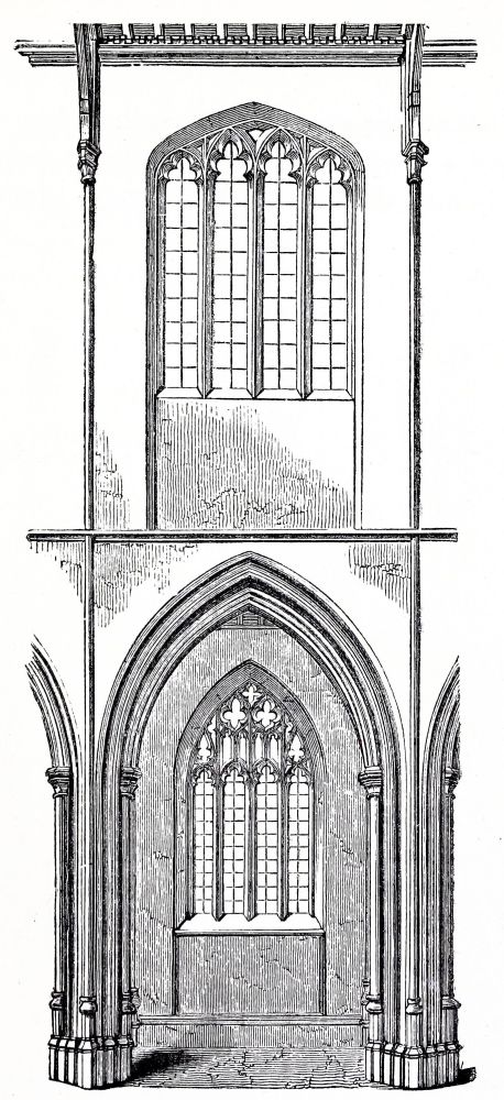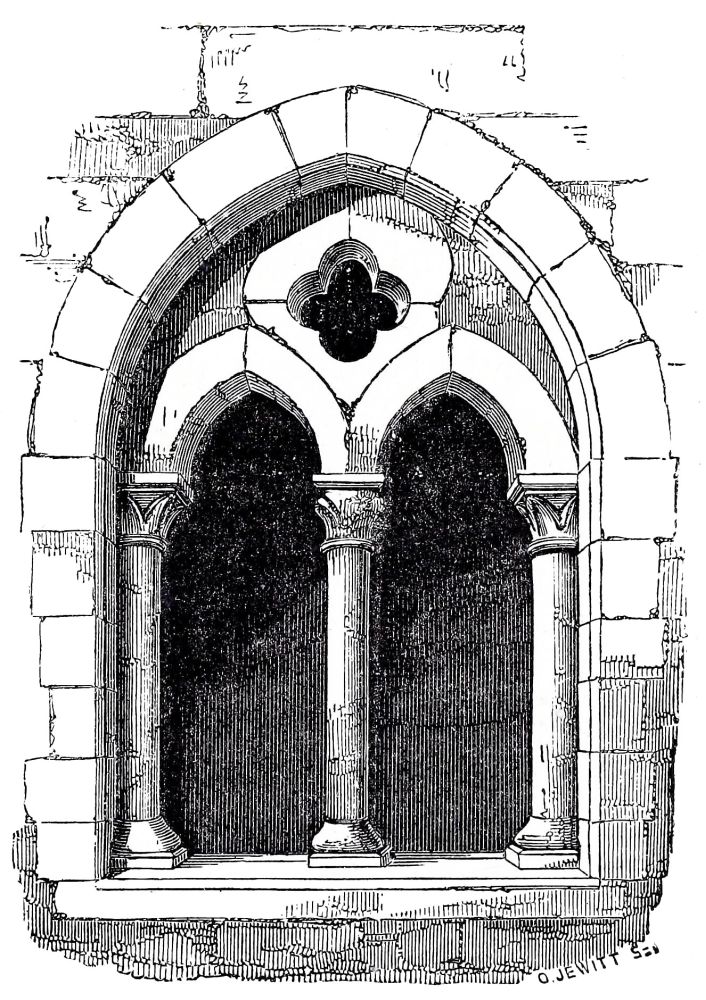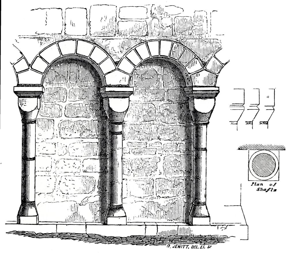 Norman Windows are in general long and rather narrow round-headed openings, but sometimes of two lights divided by a shaft, included under one arch, more especially in belfries; in rich buildings they are frequently ornamented in the same manner as the doorways, with recessed arches, zig-zag and other moldings, as at Iffley, Oxfordshire, and sometimes with sculpture; other examples have shafts in the jambs carrying the{43}