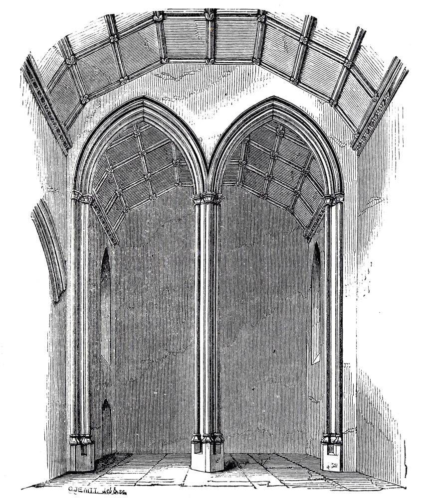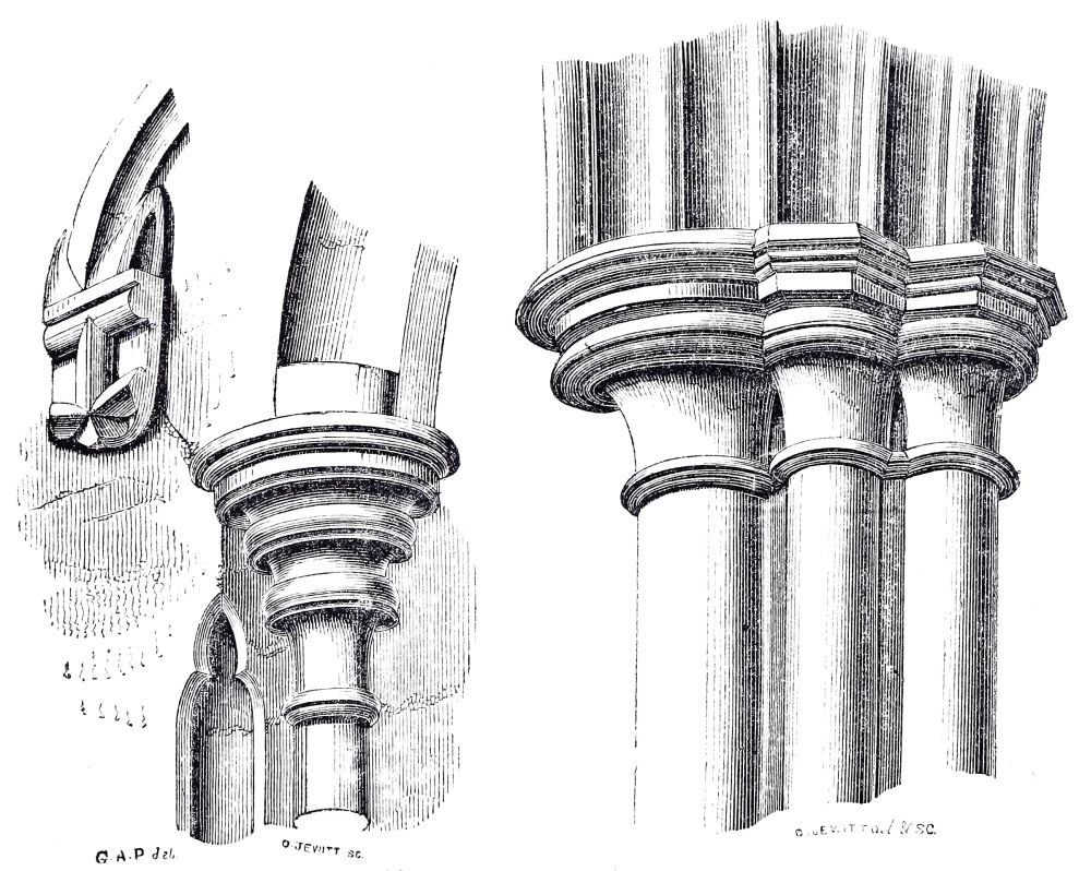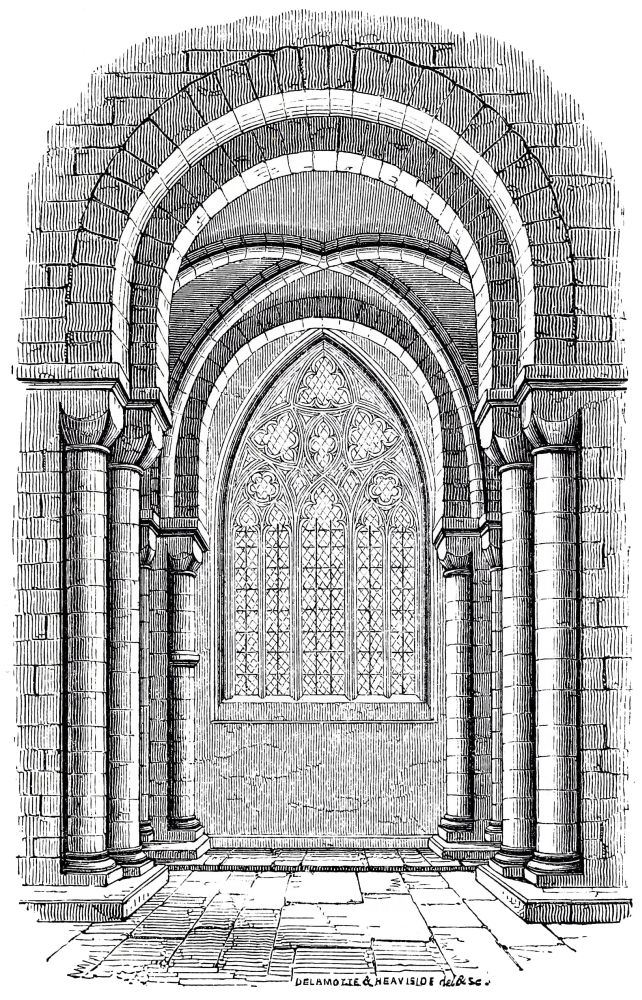 The small church of Clee at the mouth of the Humber, of which the chancel and transepts and central tower were rebuilding almost at that time, are still more Gothic, and this work was consecrated by S. Hugh in 1192, as recorded by an inscription; this was the very year in which he began rebuilding the choir at Lincoln, which was finished, as we have said, in 1200. Many of the churches of the rich Norman Abbeys in the south of Yorkshire, and north of Lincolnshire, are nearly as much advanced at the same period; and the west end of the great abbey church at St. Alban’s, begun by De Cella about A.D. 1200, is also pure Gothic: of this, unfortunately, we have only a few remains.