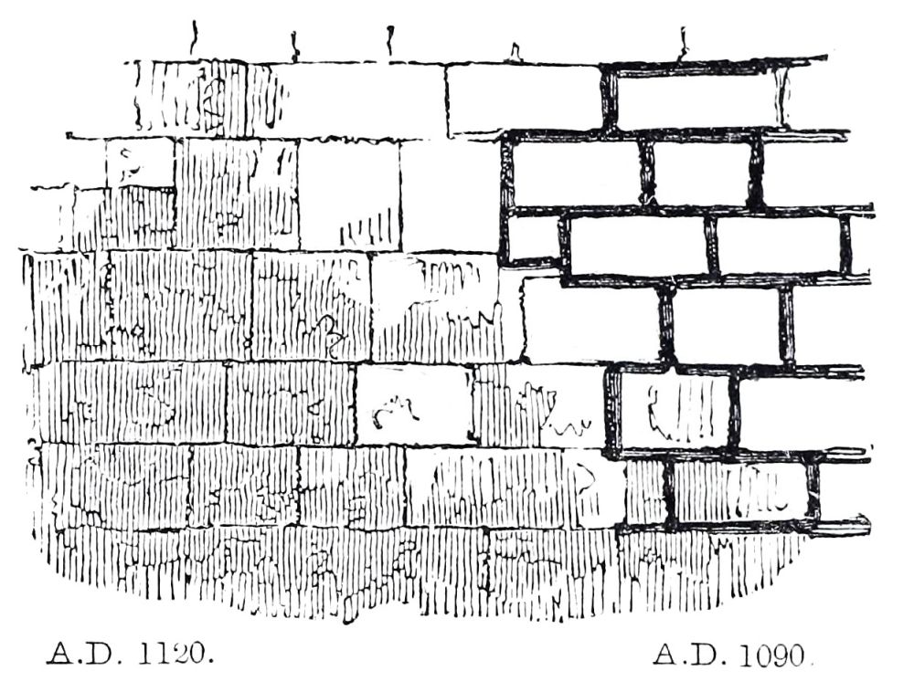 Notwithstanding this superiority of workmanship to that which had preceded it, the early Norman masonry is extremely rude and bad; the joints between the stones are often from one inch to two or three inches wide, and filled with mortar not always of very good quality. In consequence of this imperfect construction, many of the towers fell down within a few years after their erection. It is probable, however, that the workmen employed on these structures were for the most part Saxons, as the Normans must have been too much employed otherwise during the reign of the Conqueror to execute much masons’ work with their own hands. Nor were the Norman monks established in sufficient numbers to be able to superintend all the{15}