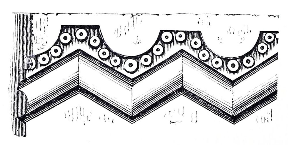 The arch is generally at first not recessed at all, afterwards only once recessed, and the edges are either square, or have a plain round molding cut upon them; the zigzag ornament is used, but not so abundantly as at a later period; the dripstone is frequently ornamented with what is called the hatched molding; the billet is also used, but sparingly, and perhaps not before 1100; it is found in the early parts of Peterborough, but not in the later parts. The head of the door is generally square with a round arch over it, and the intermediate space under the arch, called the tympanum, is either left plain, or ornamented with shallow sculpture of rude character, sometimes preserved from an earlier building.