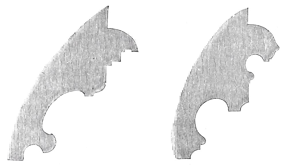 Although the roofs of the aisles at Canterbury had been vaulted, the choir itself had a flat boarded ceiling, painted like that still remaining at Peterborough. The vault of{38} the choir of the cathedral of Sens, from whence came William, the architect of the choir of Canterbury, is also an addition of later date. The same change was made in many other churches of that period. The builders of the early Norman period did not venture to erect a vault over so large a space; we do not find any early vault over a space above twenty feet wide, and few of so wide a span. Many of our Norman cathedrals still have timber roofs over the large spaces, and the aisles vaulted. In Normandy vaults were more frequently used than in England, even at this early period; and this was still more the case in subsequent times, for the fine open timber roofs for which some parts of England are distinguished are unknown in Normandy, where almost every village church is vaulted over.