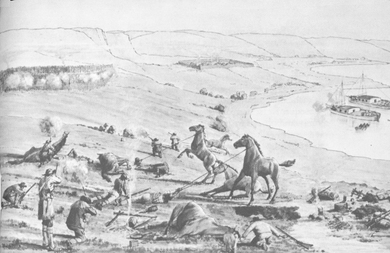 Ree Indian attack on General Ashley’s trappers. Original sketch in Oregon Trail Museum.