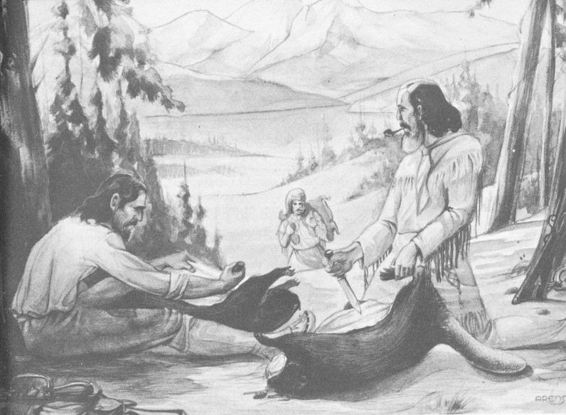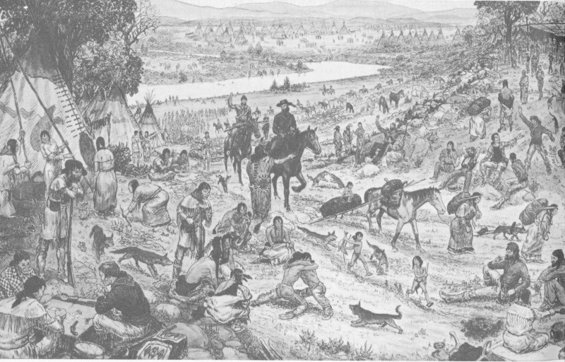 Annual rendezvous of Rocky Mountain trappers. Original sketch in Oregon Trail Museum.