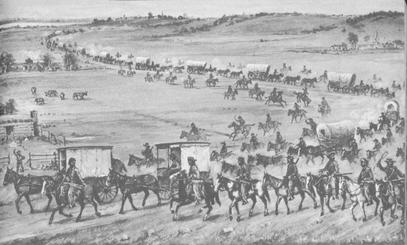12a caravan of ten wagons, drawn by five mules each, and two dearborns, drawn by one mule each ... eighty-one men in company, all mounted on mules....