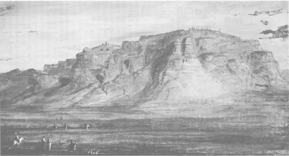 It was in 1837 that Scotts Bluff, the martial sentinel of the North Platte Valley, stood for its first portrait. The magnificent sketch, now preserved in the Walters Art Gallery in Baltimore, was the work of Alfred J. Miller, a talented artist who accompanied Sir William Drummond Stewart and William Sublette to the Green River rendezvous. Miller’s notes on Scotts Bluff reflect the same awe and imagination that inspired countless later emigrants. He writes, “At a distance as we approached it the appearance was that of an immense fortification with bastions, towers, battlements, embrazures, scarps and counterscarps.” He records also that this neighborhood abounded in delicious “Rocky Mountain pheasant,” and in jack rabbits, antelope, and bighorn.