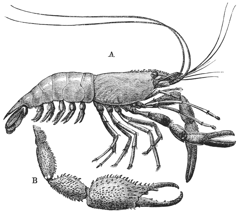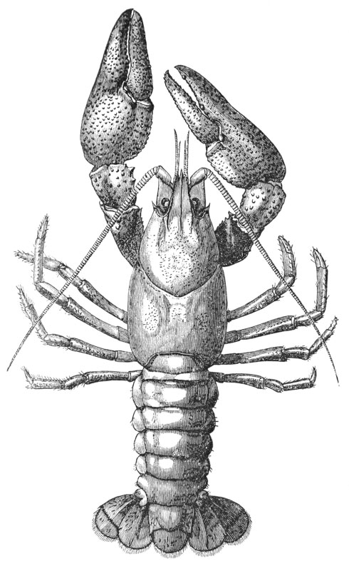 As to the origin of the technical name; ἀστακός, astakos, was the name by which the Greeks knew the lobster; and it has been handed down to us in the works of Aristotle, who does not seem to have taken any special notice of the crayfish. At the revival of learning, the early naturalists noted the close general similarity between the lobster and the crayfish; but, as the latter lives in fresh water, while the former is a marine animal, they called the crayfish, in their Latin, Astacus fluviatilis, or the “river-lobster,” by way of distinction; and this nomenclature was retained until, about forty-five years ago, an eminent French Naturalist, M. Milne-Edwards, pointed out that there are far more extensive differences between lobsters and crayfish than had been supposed; and that it would be advisable to mark the distinctness of the things by a corresponding difference in their names. Leaving Astacus for the crayfishes, he proposed to change the technical name of the lobster into Homarus, by latinising the old French name “Omar,” or “Homar” (now Homard), for that animal.