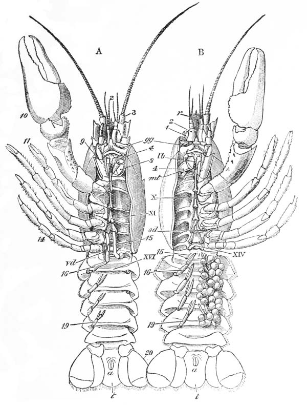 1 If crayfish are not to be had, a lobster will be found to answer to the description of the former, in almost all points; but the gills and the abdominal appendages present differences; and the last thoracic somite is united with the rest in the lobster. (See Chap. V.)