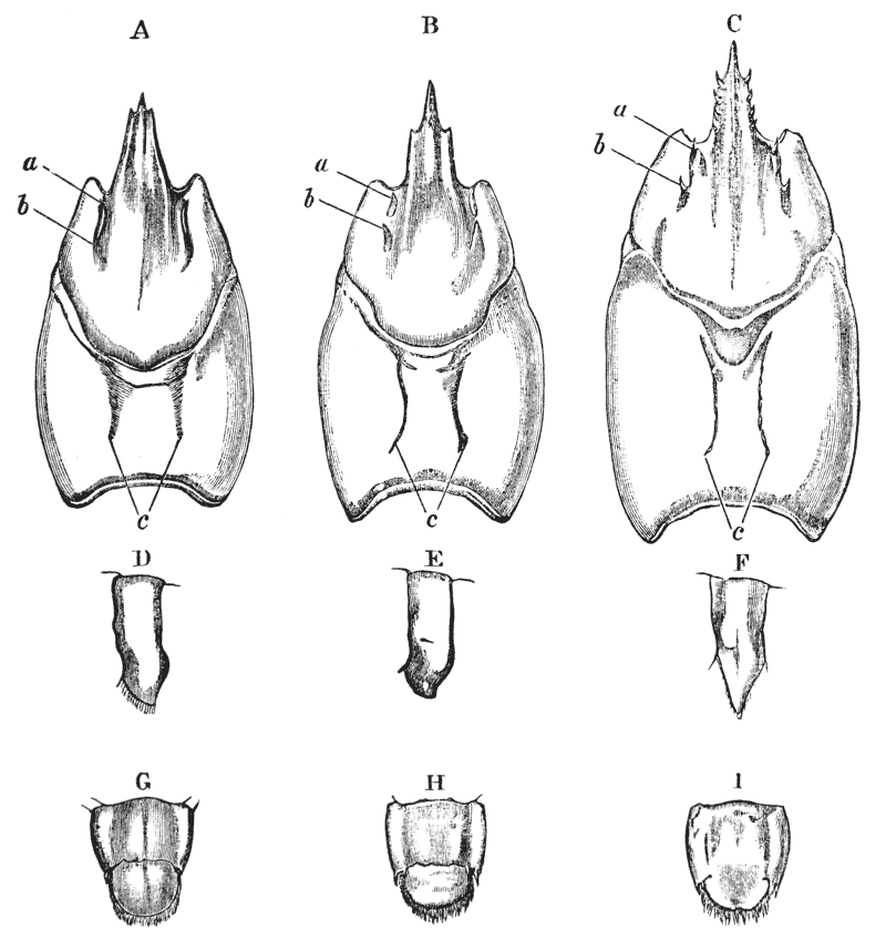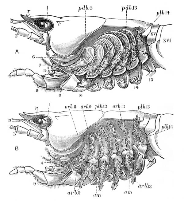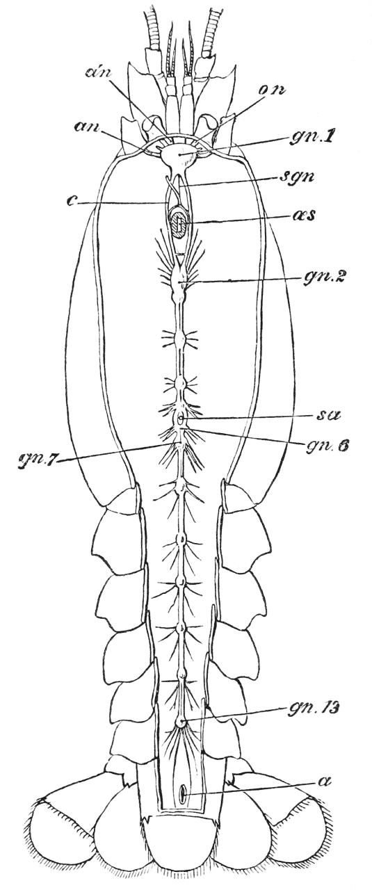 The founder of the morphology of the Crustacea, M. Milne Edwards, counts the telson as a somite, and consequently considers that twenty-one somites enter into the composition of the body in the Podophthalmia. Moreover, he assigns the anterior seven somites to the head, the middle seven to the thorax, and the hinder seven to the abdomen. There is a tempting aspect of symmetry about this arrangement; but as to the limits of the head, the natural line of demarcation between it and the thorax seems to me to be so clearly indicated between the somite which bears the second maxillæ and that which carries the first maxillipedes in the Crustacea, and between the homologous somites in Insects, that I have no hesitation in retaining the grouping which I have for many years adopted. The exact nature of the telson needs to be elucidated, but I can find no ground for regarding it as the homologue of a single somite.