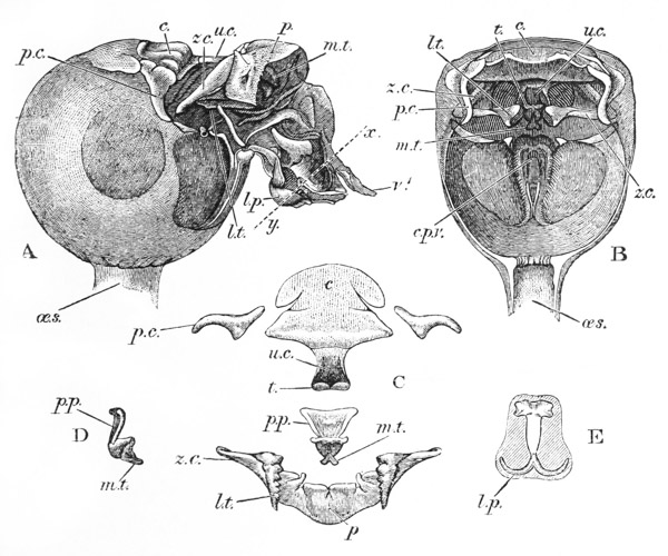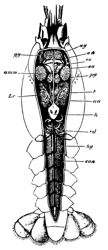 Moreover, when the stomach is laid open, three large reddish teeth are seen to project conspicuously into its interior (fig. 6, lt, mt); so that, in addition to its six pairs of jaws, the crayfish has a supplementary crushing mill in its stomach. On each side of the stomach, there is a soft yellow or brown mass, commonly known as the {31} liver (fig. 5, Lr); and, in the breeding season, the ovaries of the females, or organs in which the eggs are formed, are very conspicuous from the dark-coloured eggs which they contain, and which, like the exoskeleton, turn red when they are boiled. The corresponding part in a cooked lobster goes by the name of the “coral.”