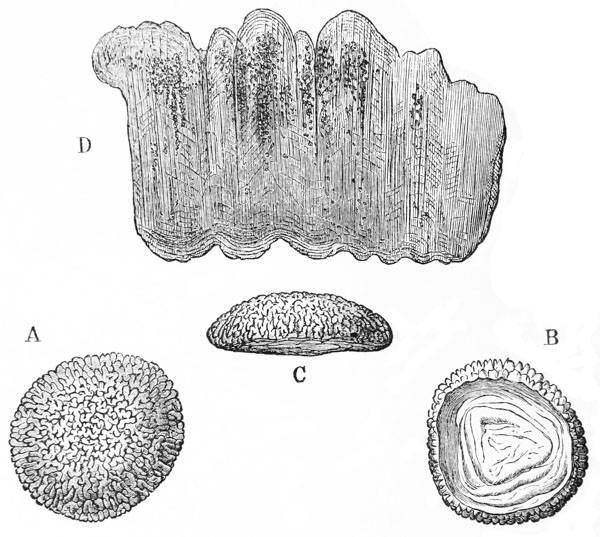 In summer, there are commonly to be found at the sides of the stomach two lenticular calcareous masses, which are known as “crabs’-eyes,” or gastroliths, and were, in old times, valued in medicine as sovereign remedies for all sorts of disorders. These bodies (fig. 7) are smooth and flattened, or concave, on the side which is turned towards {30} the cavity of the stomach; while the opposite side, being convex and rough with irregular prominences, is something like a “brain-stone” coral.