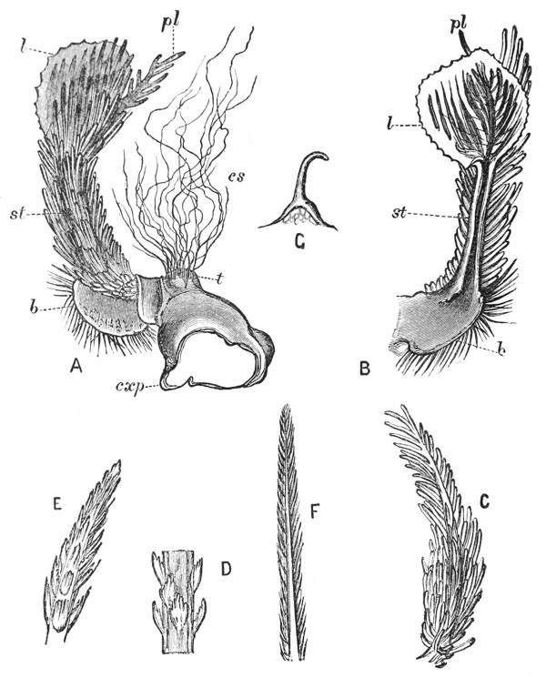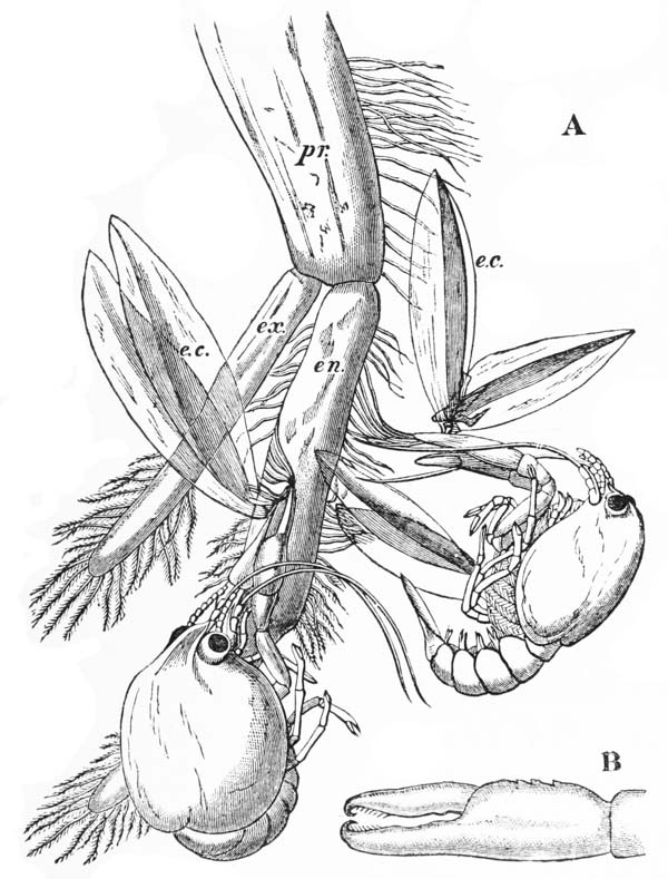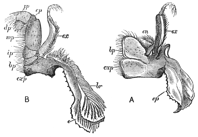 In front of the forceps, there is a pair of limbs which have a different character, and take a different direction from any of the foregoing (9). These limbs, in fact, are turned directly forwards, parallel with one another, and with the middle line of the body. They are divided into a number of joints, of which one of those near the base {23} is longer than the rest, and strongly toothed along the inner edge, or that which is turned towards its fellow. It is obvious that these two limbs are well adapted to crush and tear whatever comes between them, and they are, in fact, jaws or organs of manducation. At the same time, it will be noticed that they retain a curiously close general resemblance to the hinder thoracic legs; and hence, for distinction’s sake, they are called outer foot-jaws or external maxillipedes.