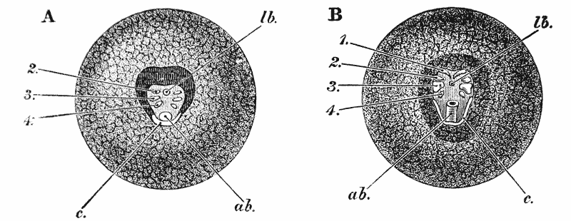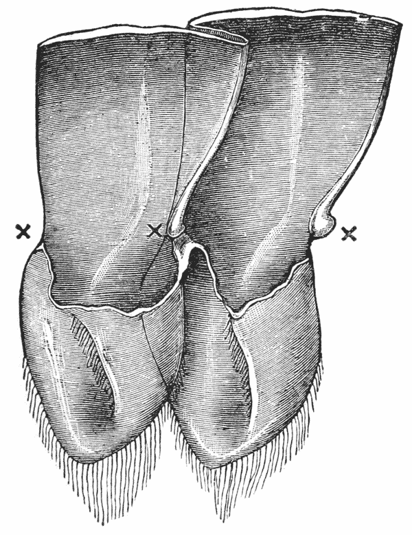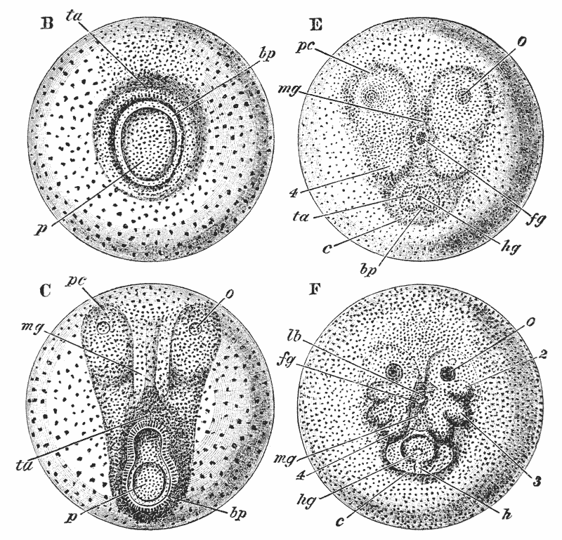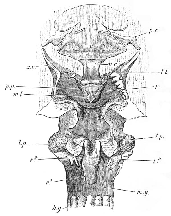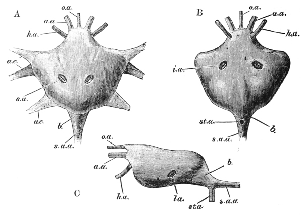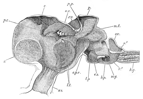 Thus the branchial chamber is altogether outside the body, to which it stands in somewhat the same relation as the space between the flaps of a man’s coat and his waistcoat would do to the part of the body enclosed by the {27} waistcoat, if we suppose the lining of the flaps to be made in one piece with the sides of the waistcoat. Or a closer parallel still would be brought about, if the skin of a man’s back were loose enough to be pulled out, on each side, into two broad flaps covering the flanks.