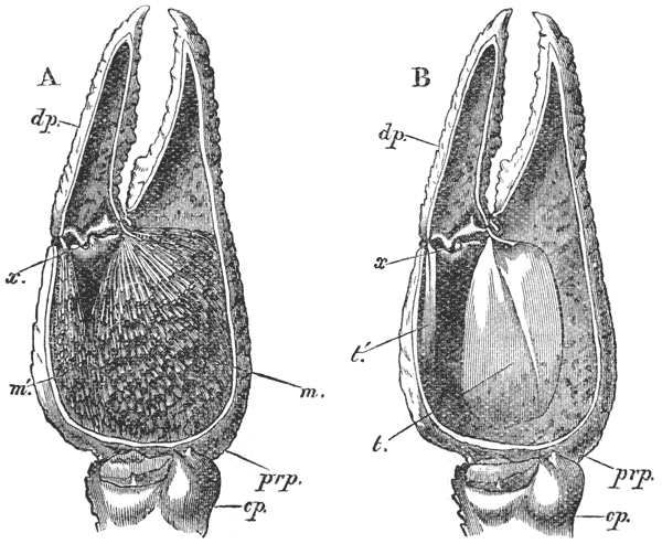 The length of time occupied from the first giving way of the integuments to the final emergence of the animal, varies with its vigour, and the conditions under which it is placed, from ten minutes to several hours. The chitinous lining of the stomach, with its teeth, and the “crabs’-eyes,” are shed along with the rest of the cuticular exoskeleton; but they are broken up and dissolved in the stomach.
