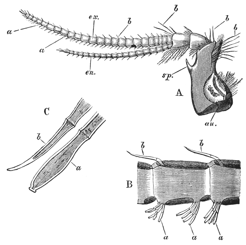 If a number of crayfishes, of about the same size, are compared together, it will easily be seen that they fall into two sets; the jointed tail being much broader, especially in the middle, in the one set than in the other (fig. 2). The broad-tailed crayfishes are the {8} females, the others the males. And the latter may be still more easily known by the possession of four curved styles, attached to the under face of the first two rings of the tail, which are turned forwards between the hinder legs, on the under side of the body (fig. 3, A; 15, 16). In the female, there are mere soft filaments in the place of the first pair of styles (fig. 3, B; 15).