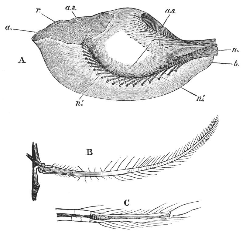 Thus we see that the crayfish has a jointed and segmented body, the rings of which it is composed being very obvious in the abdomen, but more obscurely traceable elsewhere; that it has no fewer than twenty pairs of what may be called by the general name of appendages; and that these appendages are turned to different uses, or are organs of different functions, in different parts of the body. The crayfish is obviously a very complicated piece of living machinery. But we have not yet come to the end of all the organs that may be discovered even by cursory inspection. Every one who has eaten a boiled crayfish, or a lobster, knows that the great shield, or carapace, is very easily separated from the thorax and abdomen, the head and the limbs which belong to that region coming away with the carapace. The reason of this is not far to seek. The lower edges of that part of the carapace which belongs to the thorax approach the bases of the legs pretty closely, but a cleft-like space is left; and this cleft extends forwards to the sides of the region of the mouth, and backwards and upwards, between the hinder margin of the carapace and the sides of the first ring of the abdomen, which are partly overlapped by, and partly overlap, that margin. If the blade of a pair of scissors is {25} carefully introduced into the cleft from behind, as high up as it will go without tearing anything, and a cut is then made, parallel with the middle line, as far as the cervical groove, and thence following the cervical groove to the base of the outer foot-jaws, a large flap will be removed. This flap of the carapace is called the branchiostegite (fig. 1, bg), because it covers the gills or branchiæ (fig. 4), which are now exposed. They have the appearance of a number of delicate plumes, which take a direction from the bases of the legs upwards and forwards behind, upwards and backwards in front, their summits converging towards the upper end of the cavity in which they are placed, and which is called the branchial chamber. These branchiæ are the respiratory organs; and they perform the same functions as the gills of a fish, to which they present some similarity.