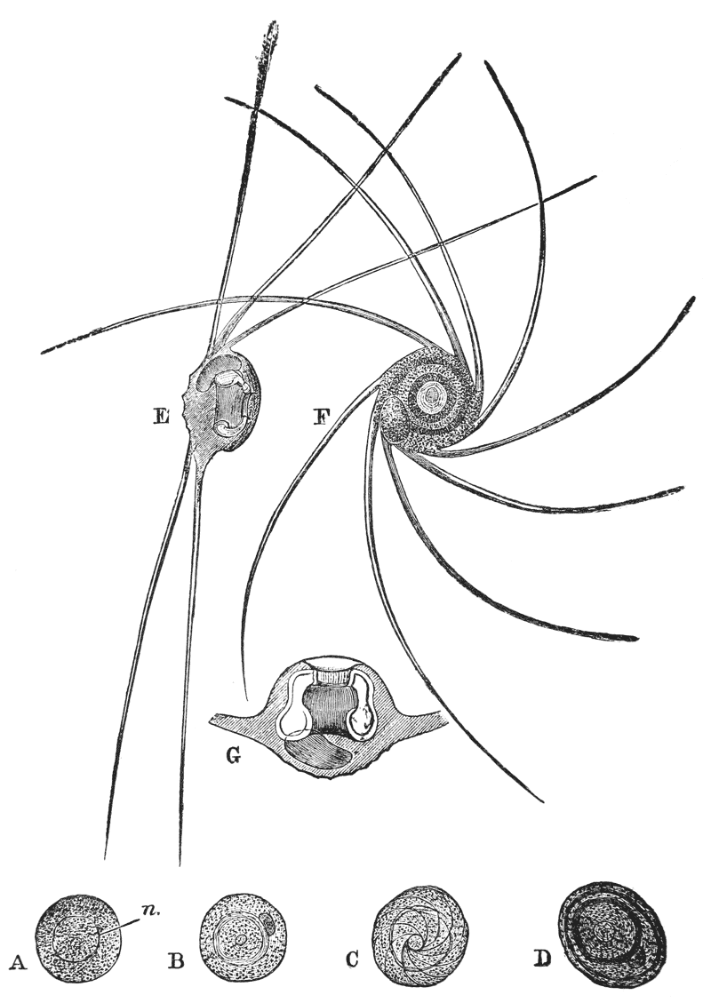 Since the discovery of the spermatozoa of the crayfish in 1835–36 by Henle and von Siebold. the structure and development of these bodies have been repeatedly studied. The latest discussion of the subject is contained in a memoir of Dr. C. Grobben (“Beiträge zur Kenntniss der männlichen Geschlechtsorgane der Dekapoden:” Wien, 1878). There is no doubt that the spermatozoon consists of a flattened or hemispherical body, produced at its circumference into a greater or less number of long tapering curved processes (fig. 34 F). In the interior of this are two structures, one of which occupies the greater part of the body, and, when the latter lies flat, looks like a double ring. This may be called, for distinctness’ sake, the annulate corpuscle. The other is a much smaller oval corpuscle, which lies on one side of the first. The annulate corpuscle is dense, and strongly refracting; the oval corpuscle is soft, and less sharply defined. Dr. Grobben describes the annulate corpuscle as “napfartig,” or cup-shaped; closed below, open above, and with the upper edge turned inwards, and applied to the inner side of the wall of the cup. It appeared to me, on the other hand, that the annulate corpuscle is really a hollow ring, somewhat {355} like one of the ring-shaped air-cushions one sees, on a very small scale. Dr. Grobben describes the spermatoblastic cells of the testis and their nuclear spindles; but his account of the development of the spermatozoa does not agree with my own observations, which, so far as they have gone, lead me to infer that the annulate corpuscle of the spermatozoon is the metamorphosed nucleus of the cell from which the spermatozoon is developed. For want of material, however, I was unable to bring my investigations to a satisfactory termination, and I speak with reserve.