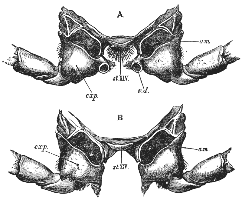 In front of these legs, come the great prehensile limbs (10), which are chelate, like those which immediately follow them, but vastly larger. They often receive the special name of chelæ; and the large terminal joints are called the “hand.” We shall escape confusion if we call these limbs the forceps, and restrict the name of chela to the two terminal joints.