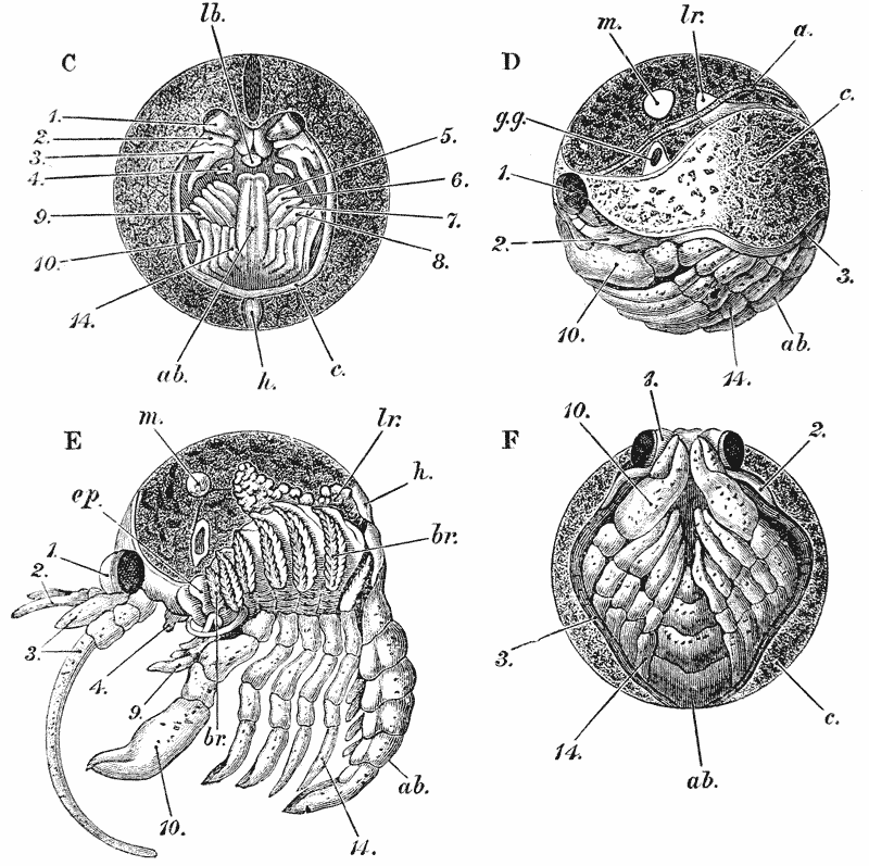 The origin of the viscous matter which fills the abdominal chamber when the eggs are deposited in it, and the manner in which these become fixed to the abdominal limbs is discussed by Lereboullet (“Recherches sur le mode de fixation des œufs aux faux pattes abdominaux dans les Écrevisses.” Annales des Sciences Naturelles, 4e Ee. T. XIV. 1860), and by Braun (Arbeiten aus dem Zoologisch-Zootomischen Institut in Würzburg, II.).
