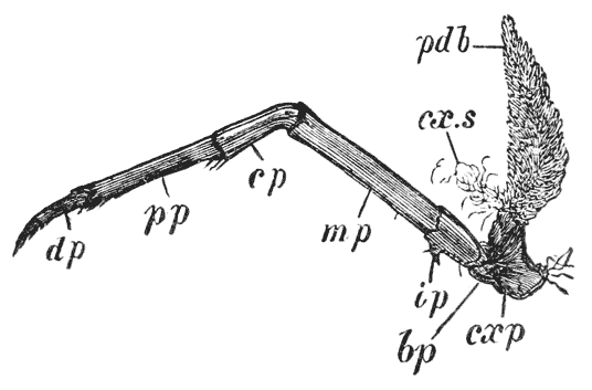 The four pairs of legs which are employed for walking purposes, are divided into a number of joints, and the foremost two pairs are terminated by double claws, arranged so as to form a pincer, whence they are said to {22} be chelate. The two hindermost pairs, on the other hand, end in simple claws.