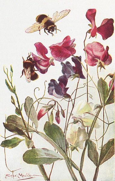 Der Honig in den Veilchen ist nicht so leicht zu finden. Aber wir haben ihn doch entdeckt. Wenn man ein Veilchen von vorn ansieht, so zeigt es fünf dunkelblaue Blätter mit einem kleinen gelben Staubbeutel in der Mitte. Aber wenn man die Rückseite des Blättchens ansieht, so wird man einen kleinen, länglichen Sack finden, der wie der Finger eines Handschuhs aussieht. Diesen haben wir oft abgerissen und ausgesogen. Er ist voll von Honig. Wenn die Biene auf der Blüte sitzt und ihren Kopf in den gelben Staubbeutel in der Mitte hineinsteckt, schlürft sie den Honig mit ihrer Zunge aus dem Sacke hinter der Blüte.