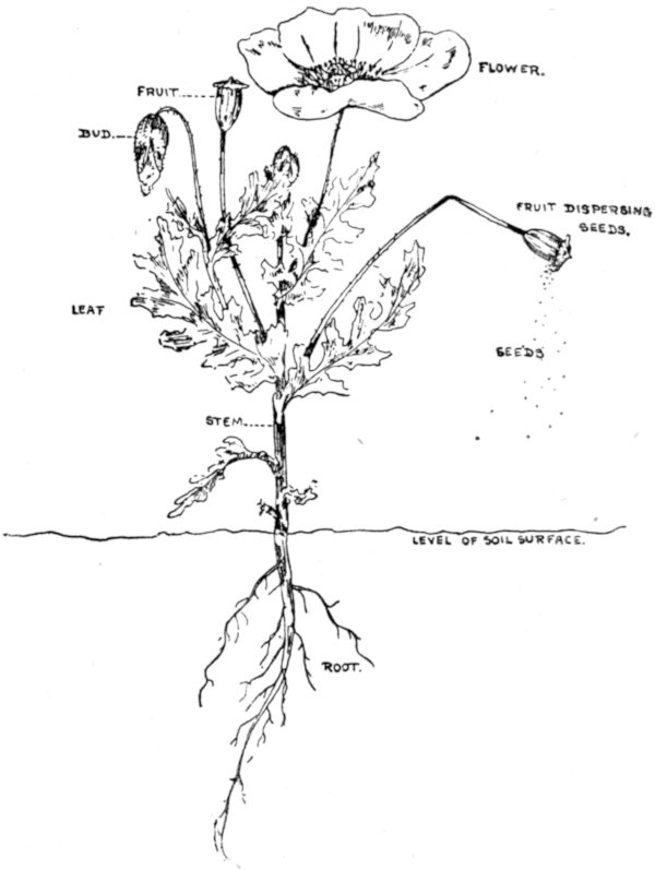The most interesting subjects are often left out of the more elementary books, or even if given are frequently set forth in such a lifeless and pedantic fashion, that little real interest or understanding has been awakened in the young student. The present work attempts to avoid the time-worn methods of arranging the subject. Children generally know more about the behaviour[viii] of animals than that of plants (being themselves animals and frequently having kittens or other pets); hence, the parallels between the life-functions of plants and those of animals are pointed out whenever possible. Once the idea of their “livingness” has been fully realised, it is time to go on to the study of the details of the plant’s body, and then to the communities of plants which grow together. In this way the child can work out from its own observations a complete and logical idea of the living plant, instead of having merely acquired a detailed but fruitless knowledge of barren facts.