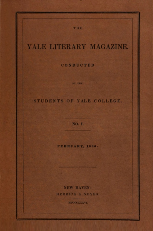 The Project Gutenberg EBook of The Yale Literary Magazine, Volume I, Number 1, by Students of Yale This eBook is for the use of anyone anywhere in the United States and most other parts of the world at no cost and with almost no restrictions whatsoever. You may copy it, give it away or re-use it under the terms of the Project Gutenberg License included with this eBook or online at www.gutenberg.org. If you are not located in the United States, you'll have to check the laws of the country where you are located before using this ebook. Title: The Yale Literary Magazine, Volume I, Number 1 Author: Students of Yale Release Date: April 23, 2019 [EBook #59339] Language: English Character set encoding: UTF-8 *** START OF THIS PROJECT GUTENBERG EBOOK THE YALE LITERARY MAGAZINE *** Produced by hekula03, Charlie Howard, and the Online Distributed Proofreading Team at http://www.pgdp.net (This book was produced from images made available by the HathiTrust Digital Library.)